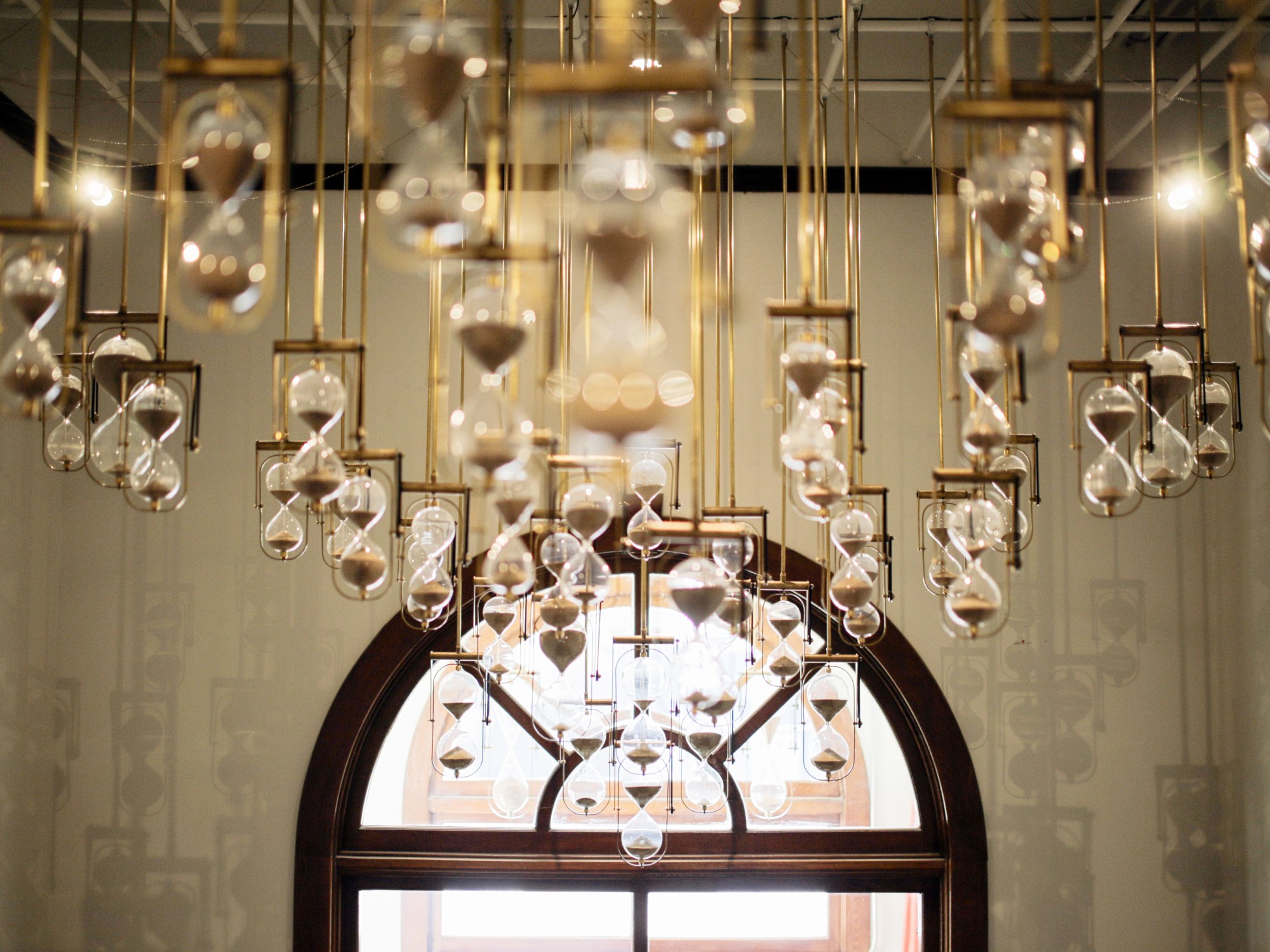 The hourglasses are filled with sand crushed from sandstone bricks collected during cSPACE’s renovations. Smashed, ground, sifted, mixed, and measured into each hand-blown hourglass, the sand tracks 0 seconds to 4 hours in hourglasses measuring 5 inches to 2 feet in height. Every few seconds, different hourglasses flip mathematically, controlled by motors, sensors, and microcomputers. An internal clock uses GPS to ensure the hourglasses flip on schedule, regardless of power outages or electrical issues.